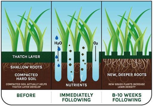 Aeration helps break down thatch and loosen soil for better oxygen and water penetration. Regular aeration will help keep your lawn's root system healthy.